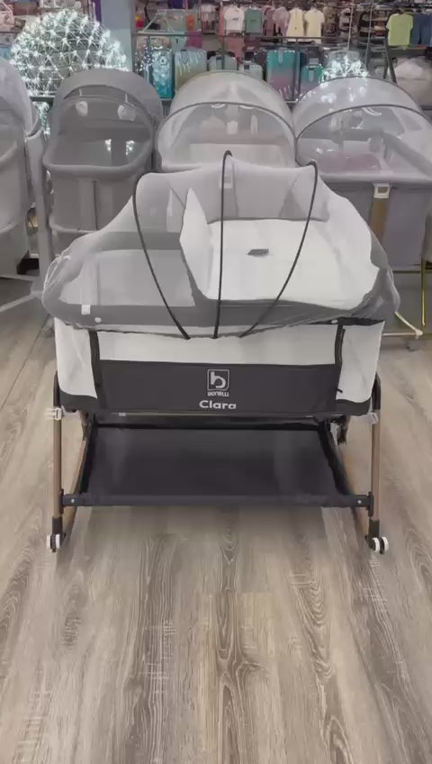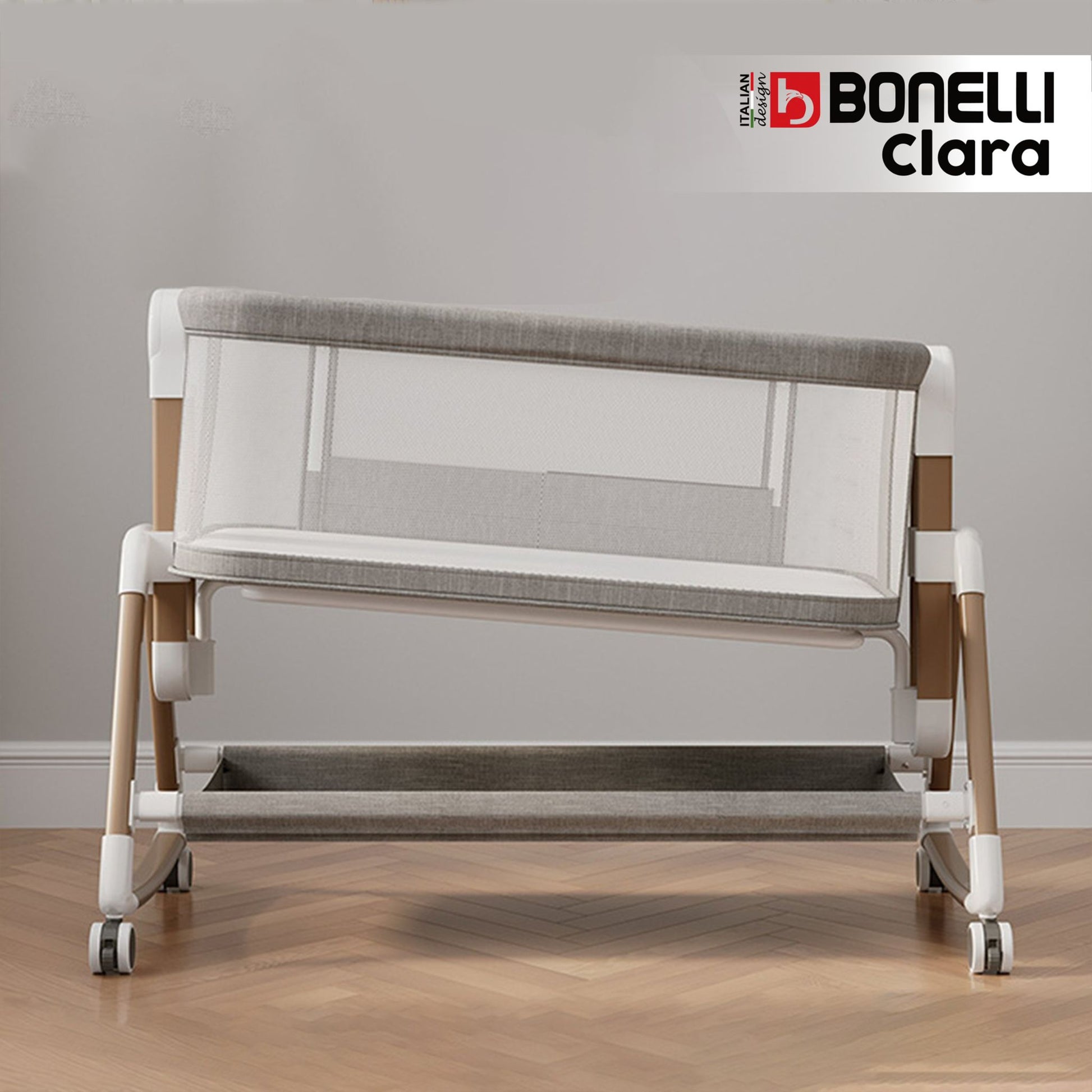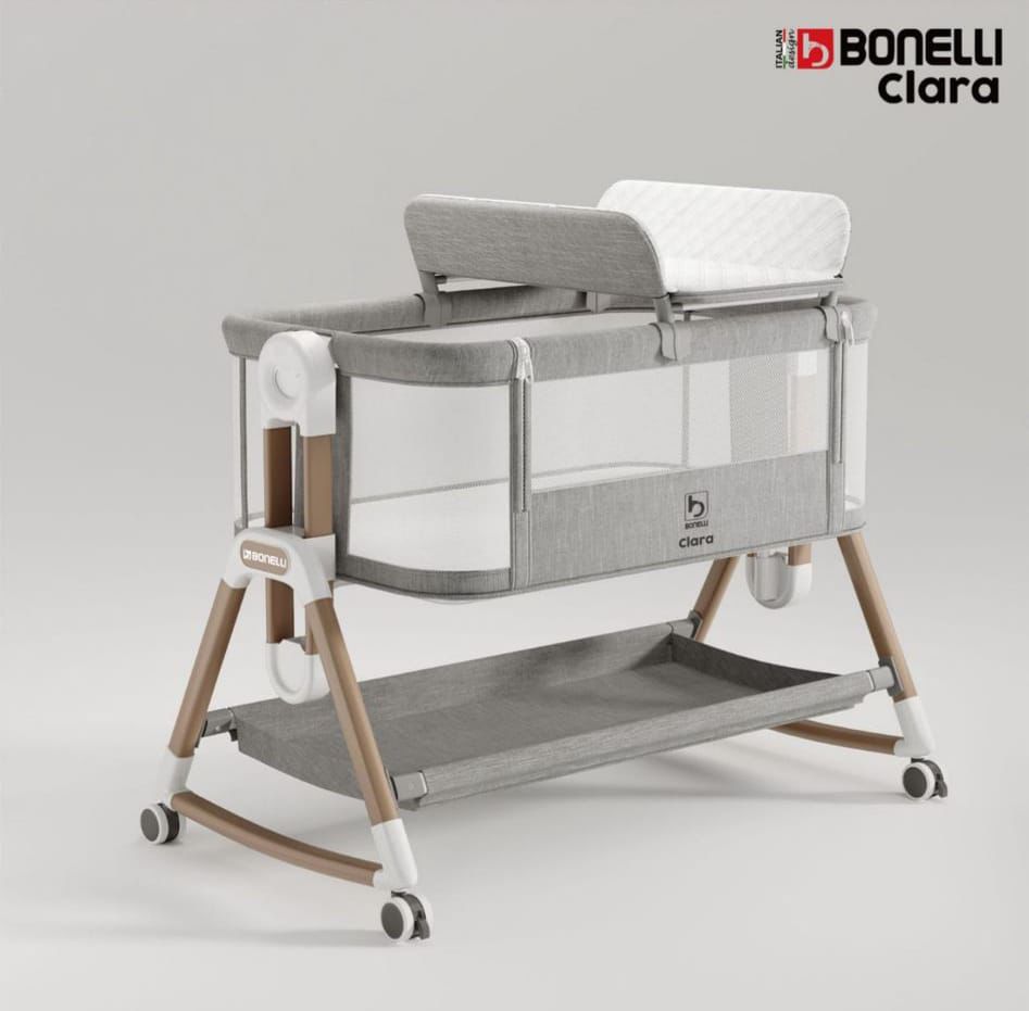 BONELLI CLARA je multifunkcionalna kolevka. Idealna za uzrast od 0 do 2 godine. Kolevka je izrađena od visoko kvalitetnog materijala, što je čini izuzetno stabilnom i sigurnom. Posebno je dizajnirana zlatnom metalnom konstrukcijom sa više različitih podešavanja visine omogućavajući vam da je prilagodite svojim potrebama. Kolevka je dizajnirna sa prozračnom mrežicom u krug radi boljeg nadzora deteta. Prednja stranica se lako spušta i podiže možete da je štelujete prema vašem krevetu što vam dodatno olakšava i pomaže u jos boljem nadzoru deteta. Lako se sklapa (može se nositi na putovanjima).